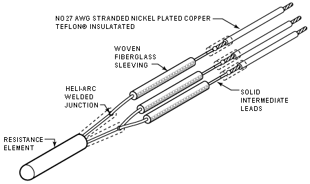 Intermediate leadwires are often used due to the length of the sensor assembly or the temperature profile exceeding the capabilities of the external leadwire (see Figure 5). Intermediate leadwires are usually solid as opposed to stranded for external wires. Solid wires are chosen because they are easier to handle, and are not subject to flexing. Common materials used for intermediate leads are: nickel, copper, constantan, nickel-plated or clad copper (most common), stainless steel clad copper, or platinum. The intermediate leadwires are then insulated with ceramic tubing, fiberglass sleeving, or organic sleeving if the temperature permits. External leadwires may be specified by the customer, but are usually stranded, plated copper conductors insulated with Teflon® or fiberglass.